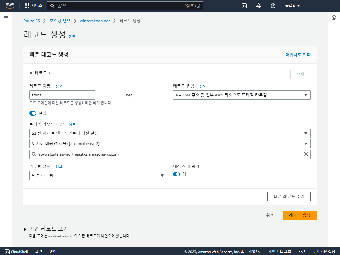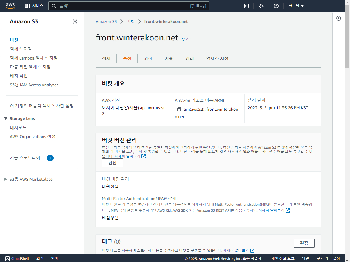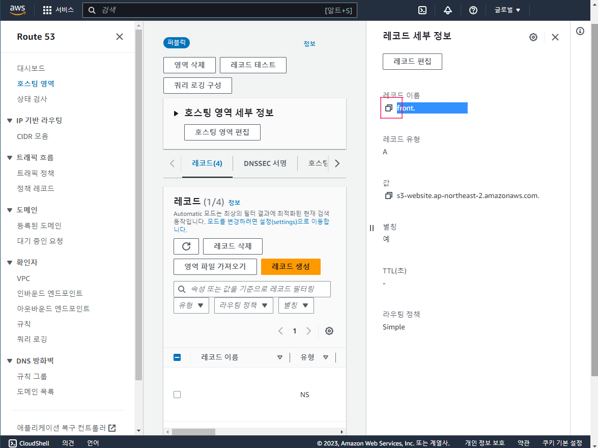 ※ 예시에서는 버킷과 도메인에 front. 를 앞에 붙여 생성했습니다.