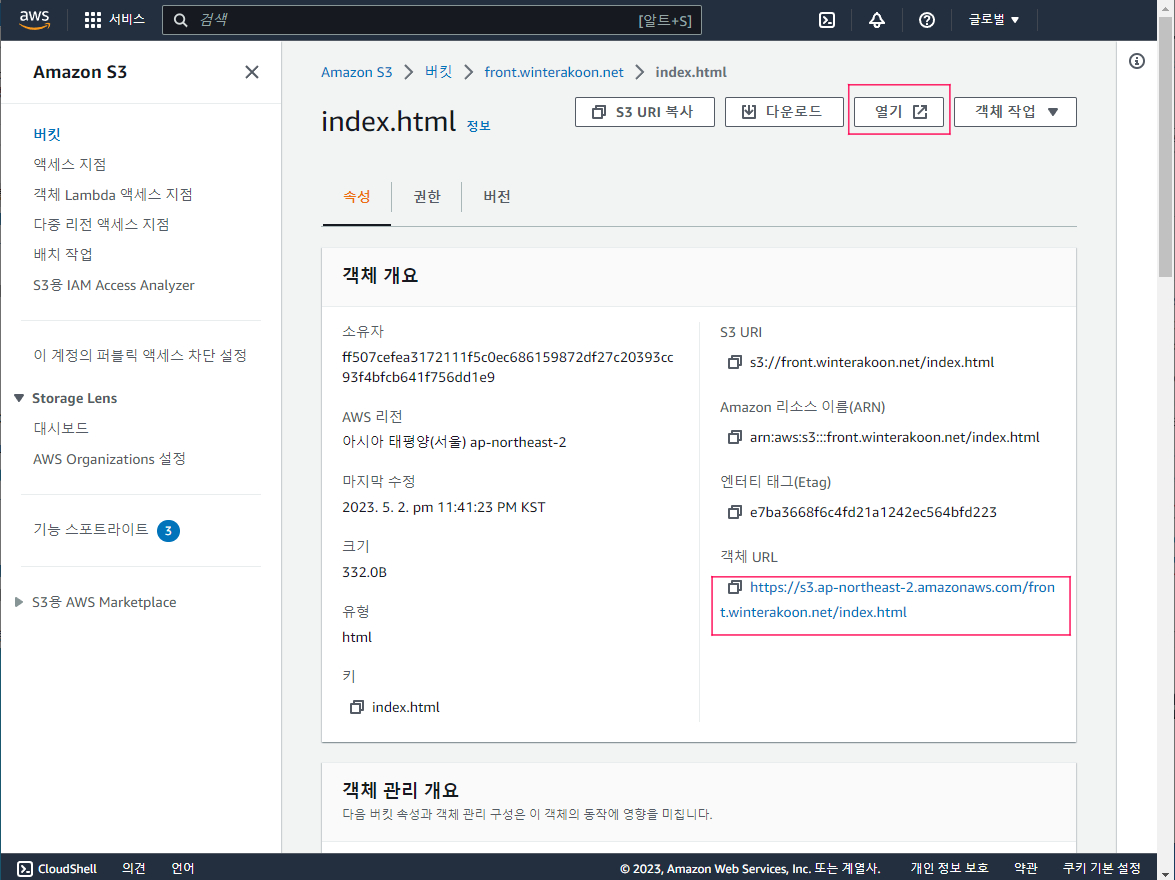 ※ 열기로 접속시 작성한 html이 보이지만 object URL 접속시 Access Denied