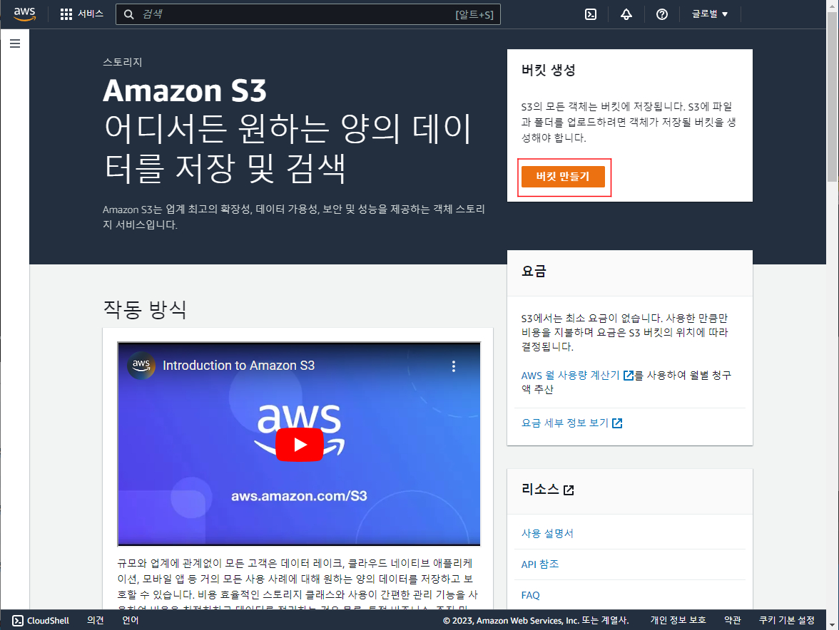 인터넷 스토리지 서비스입니다. 이 서비스는 개발자나 IT 운영자가 웹 규모 컴퓨팅 작업을 수행하는 데 필요한 데이터 저장 공간을 제공합니다. Amazon S3는 웹 사이트 호스팅, 온라인 백업, 데이터 아카이브, 기업 애플리케이션, Big Data 분석 등 다양한 용도로 사용됩니다. 콘솔창에서 region 상관없이 S3를 모두 확인할 수 있습니다.