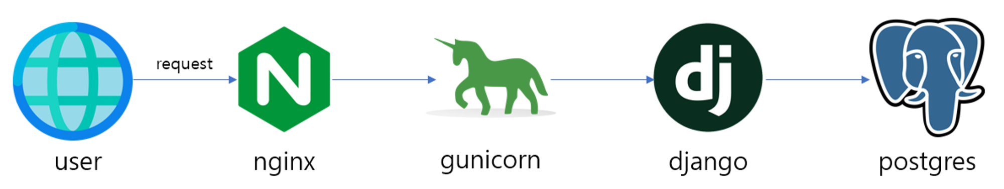 이후 gunicorn에서는 django로, django에서는 필요에 따라 데이터베이스에 쿼리를 날려 개발자가 작성한 코드를 실행하게 됩니다.