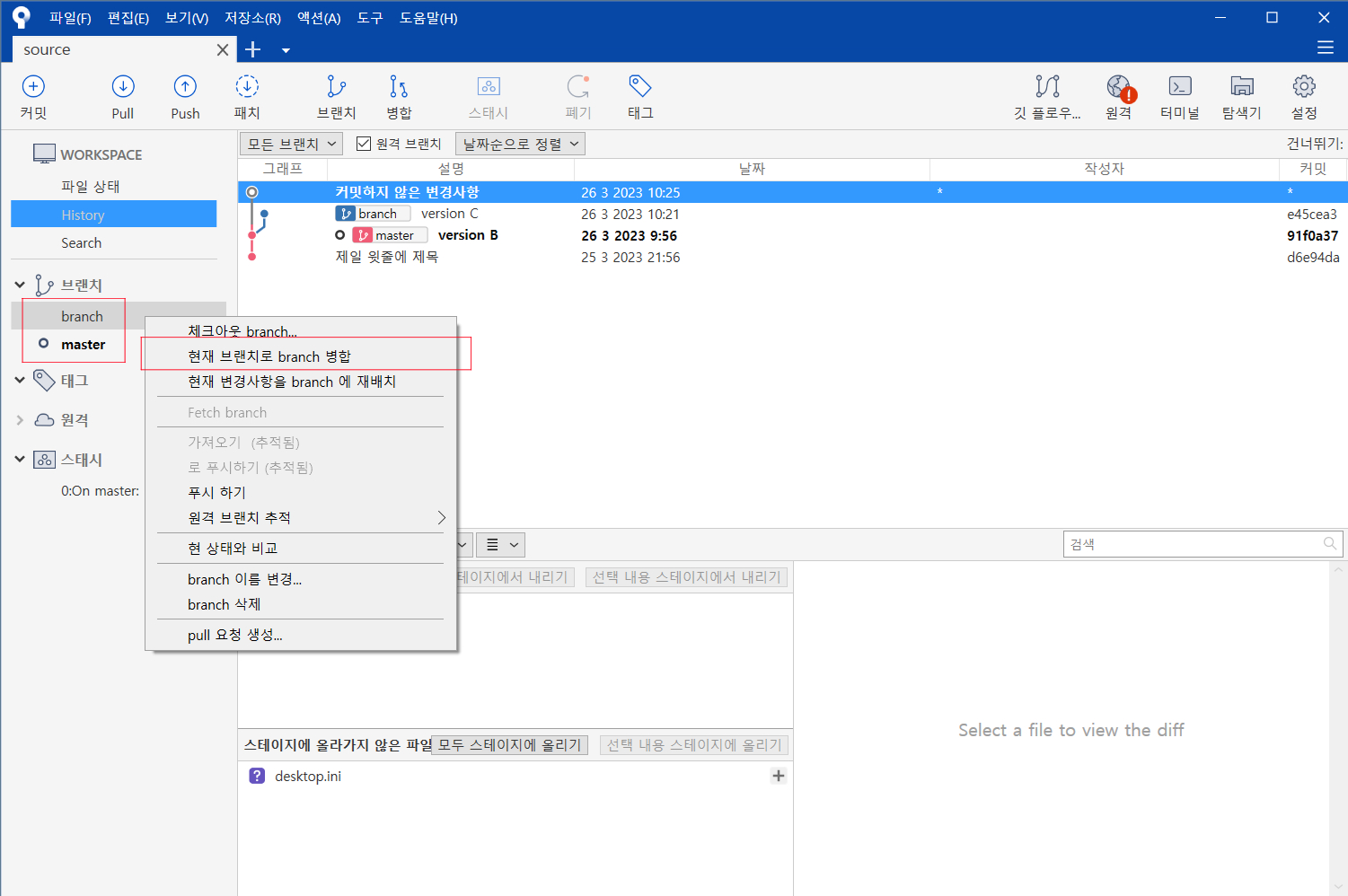 branch에서 오른쪽 버튼 클릭 후 '현재 브랜치로 branch 병합'을 클릭합니다.