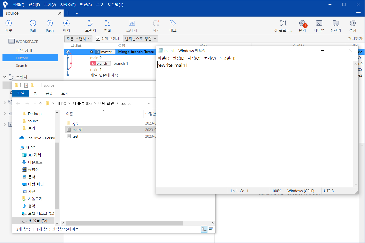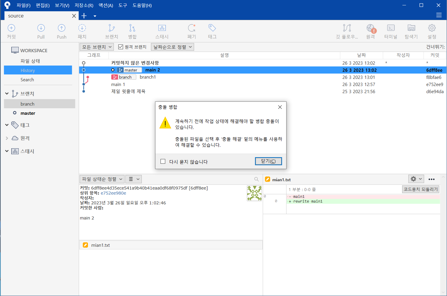 master와 branch모두 각각 수정된 main이라는 파일을 커밋했습니다.