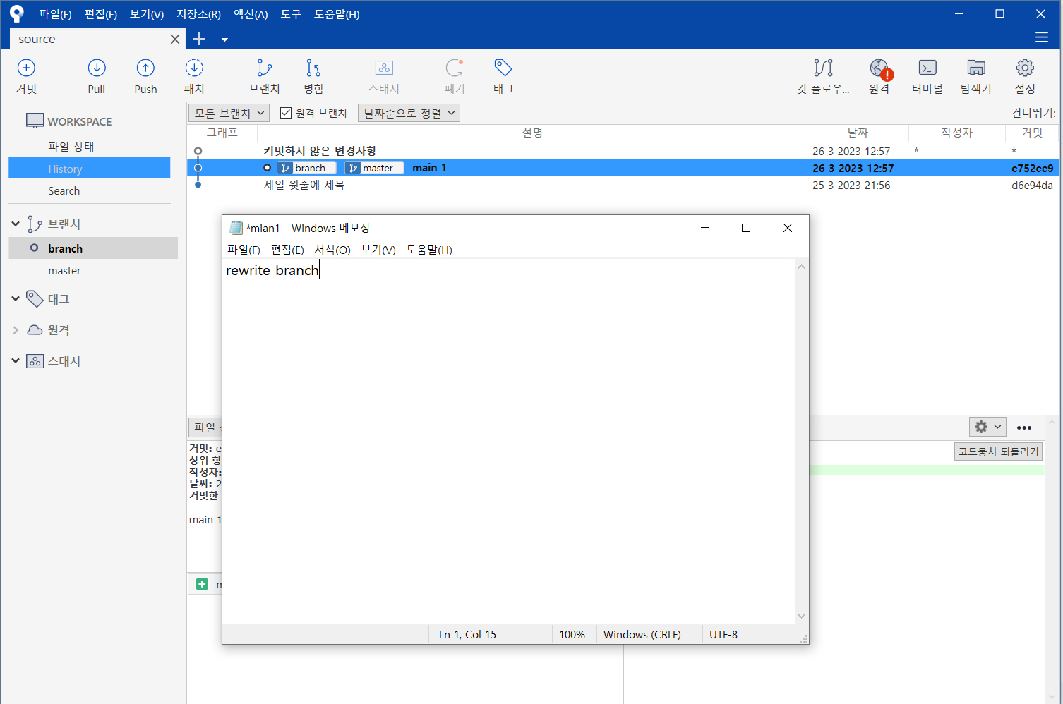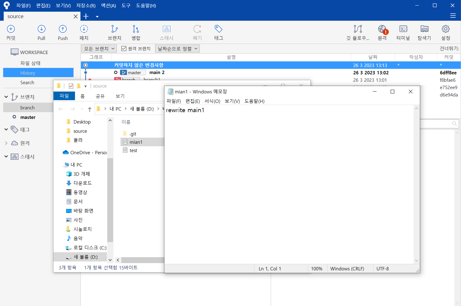 브랜치를 생성한 뒤 main1 파일의 내용을 수정하여 커밋 합니다.