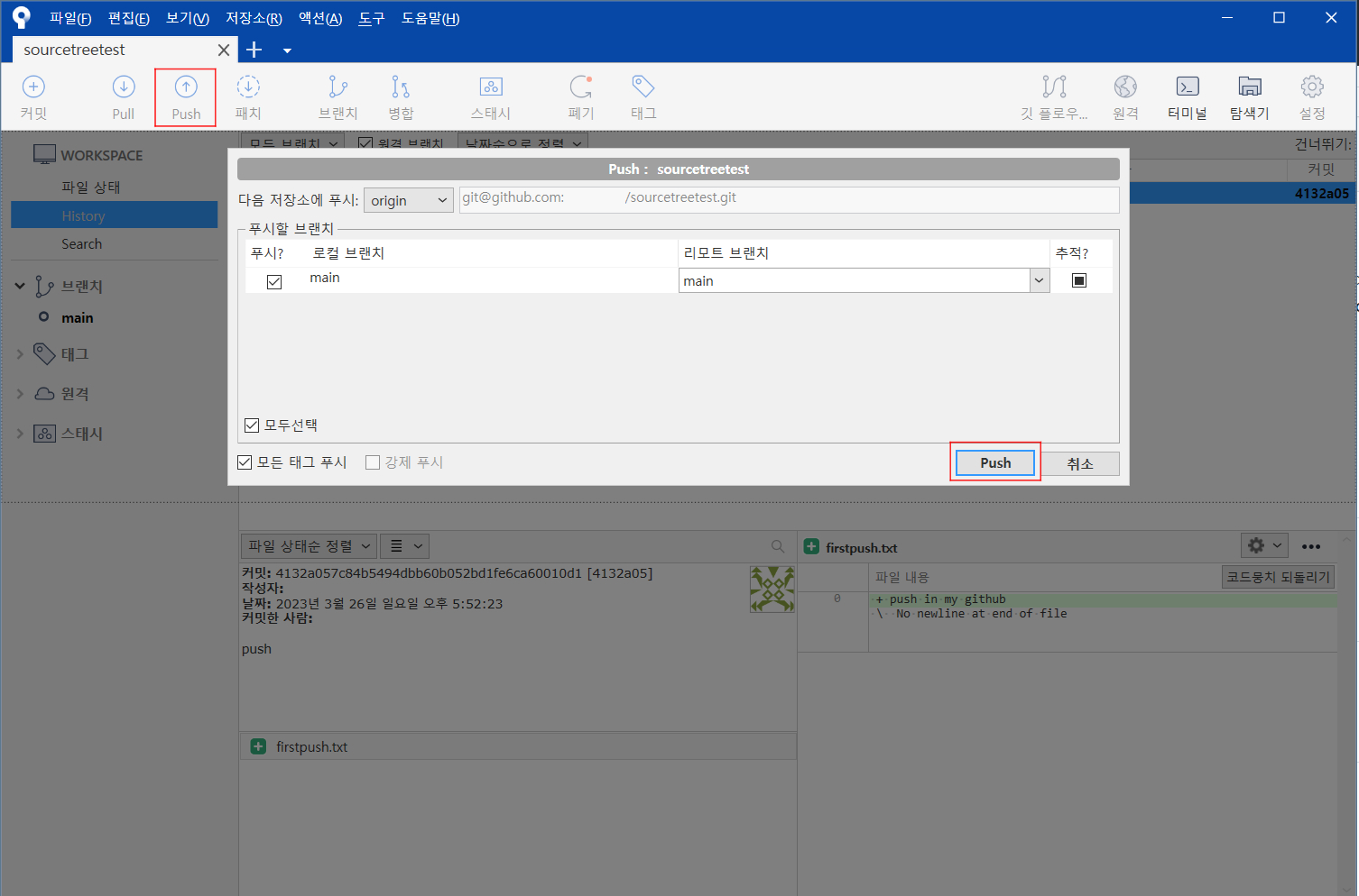 Push 버튼을 눌러 커밋한 내용을 푸시합니다.
