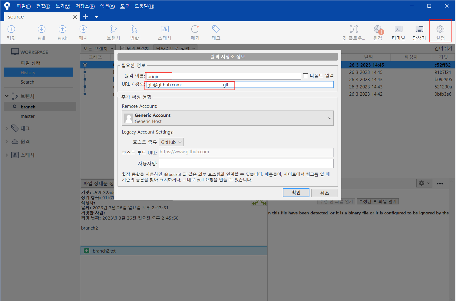 원격 이름을 설정하고 URL에 저장소 주소를 붙여넣습니다.