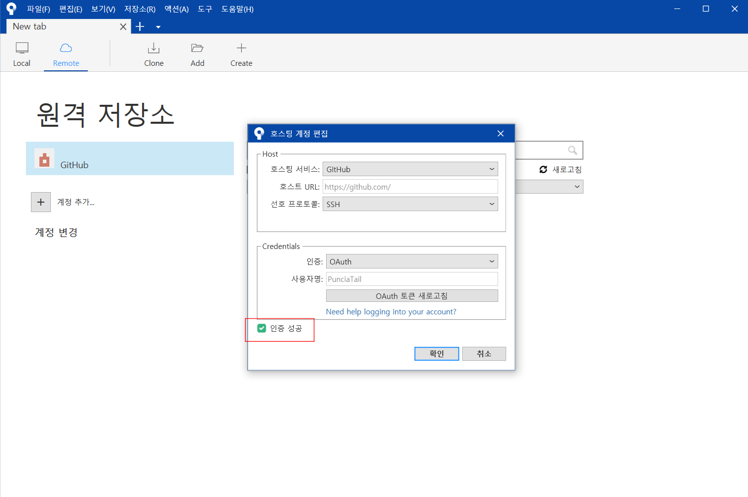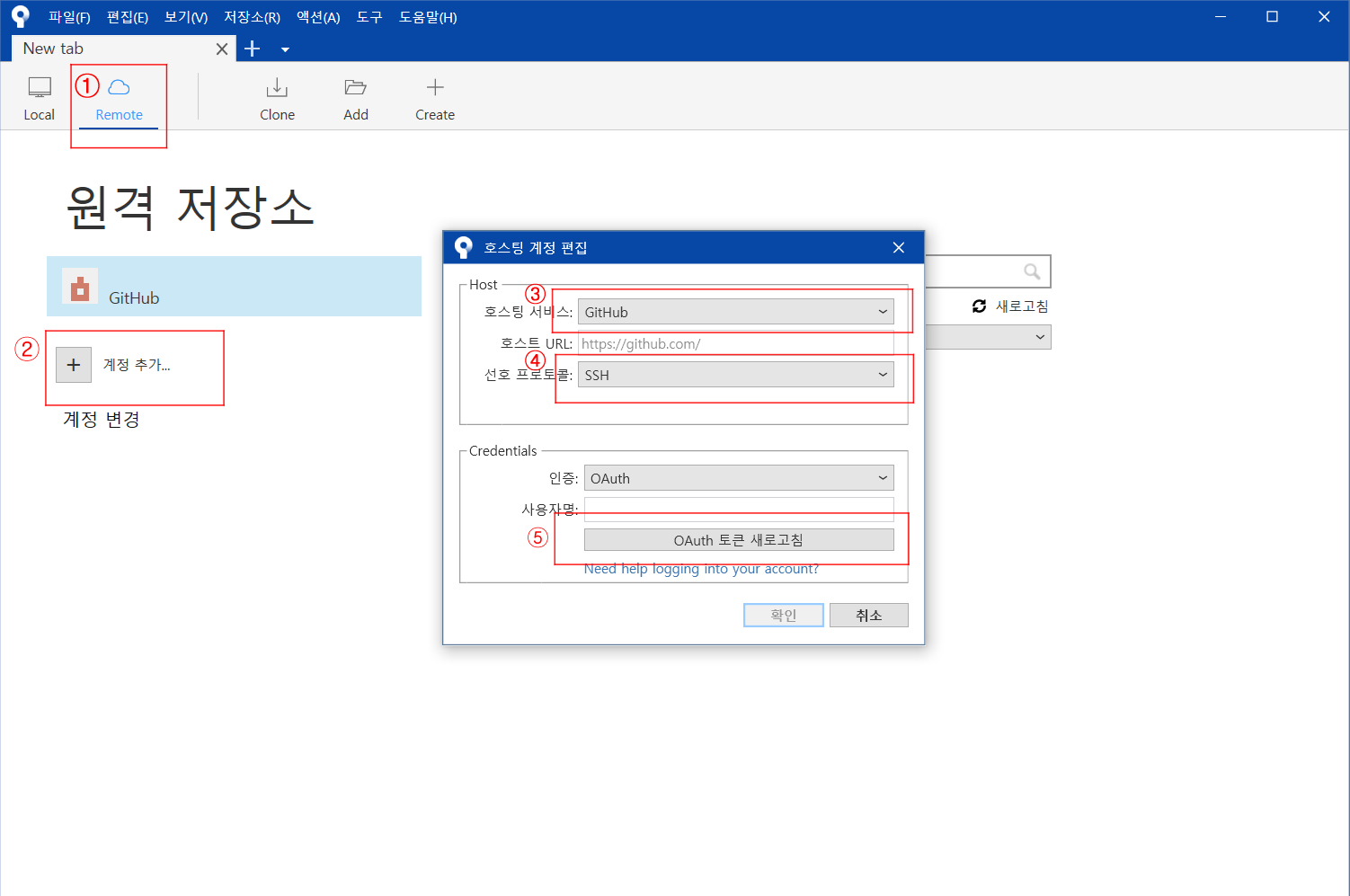 Remote => 계정 추가 => 화면에 맞게 설정을 바꾸시고 OAurth 토큰 새로고침을 눌러주세요.