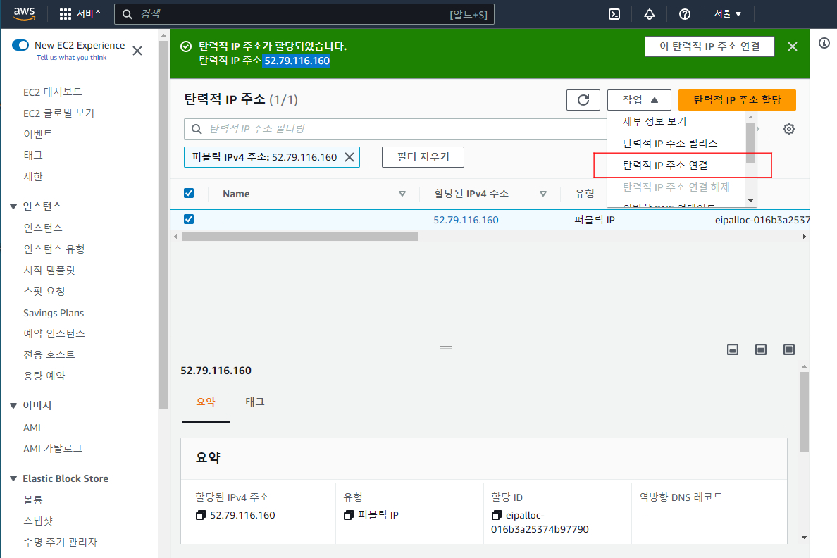 - 탄력적 IP 주소 (Elastic IP Address) - 탄력적 IP 주소는 EC2 인스턴스에 고정 IP 주소를 할당합니다. 이는 EC2 인스턴스를 중지하거나 시작할 때마다 IP 주소가 변경되는 것을 방지할 수 있습니다.